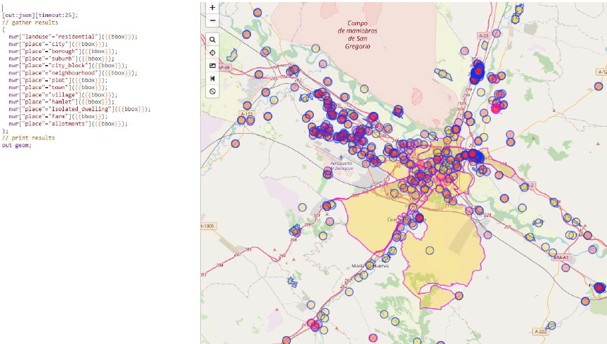 Example of the query to identify populated places in Overpass Turbo