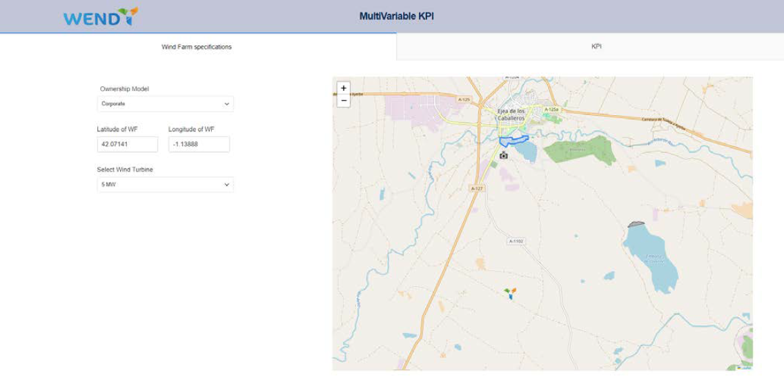 The tool will have two tabs. The first one will allow to select the location of the turbine. We can click on the map or fill the coordinates in the form. The WENDY symbol will mark the chosen location. In a blue polygon or circle we can see the location of the closest populated area, and with the camera symbol we can see the closest site of touristic interest. In the left form we must also select the ownership model (social, hybrid or corporate) and the wind turbine model.