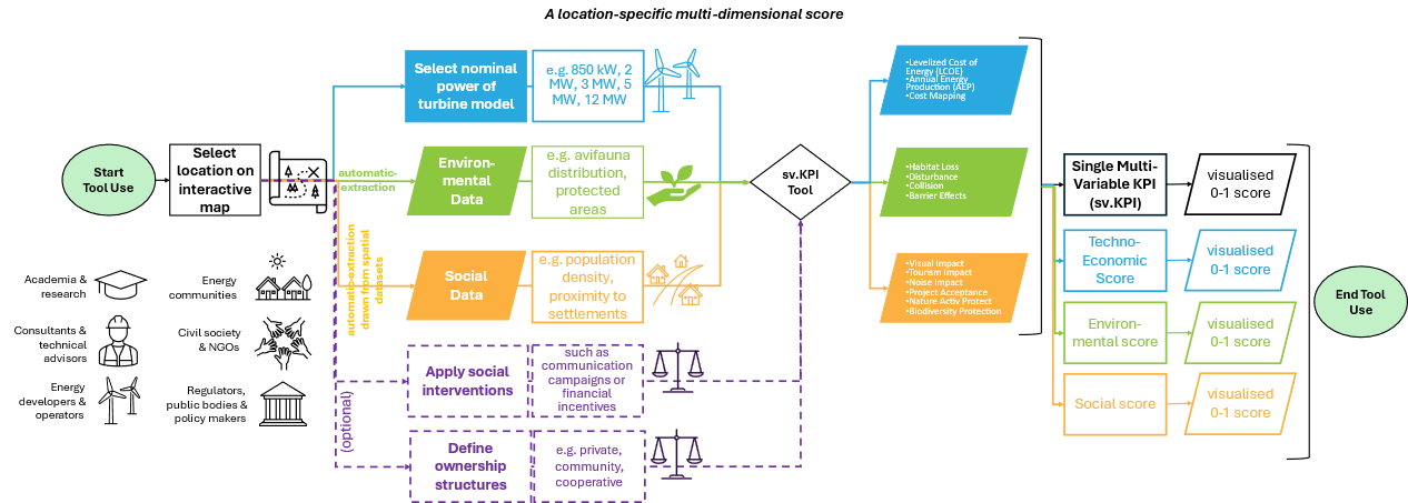 The single multi-variable KPI (SMV-KPI) is a comprehensive assessment tool developed within the WENDY project to evaluate wind farm projects based on three critical dimensions: social, environmental, and techno-economic impacts. This holistic approach ensures that the overall well-being of a wind farm is captured in a single, adaptable metric.