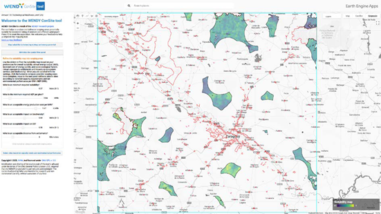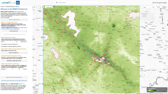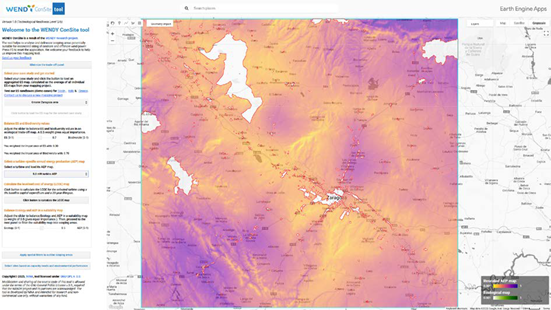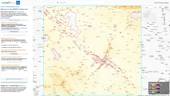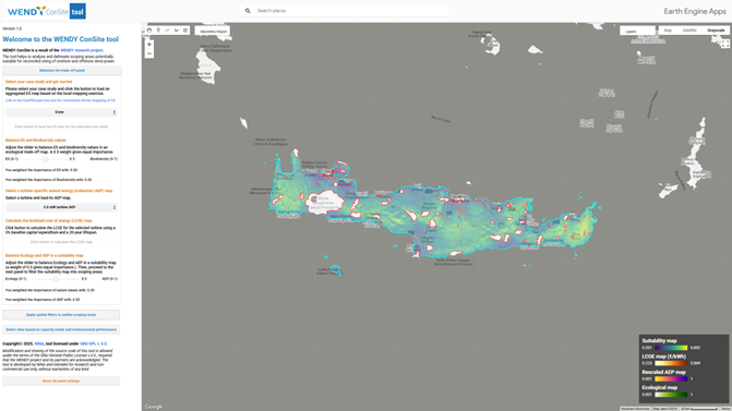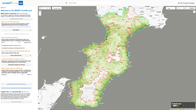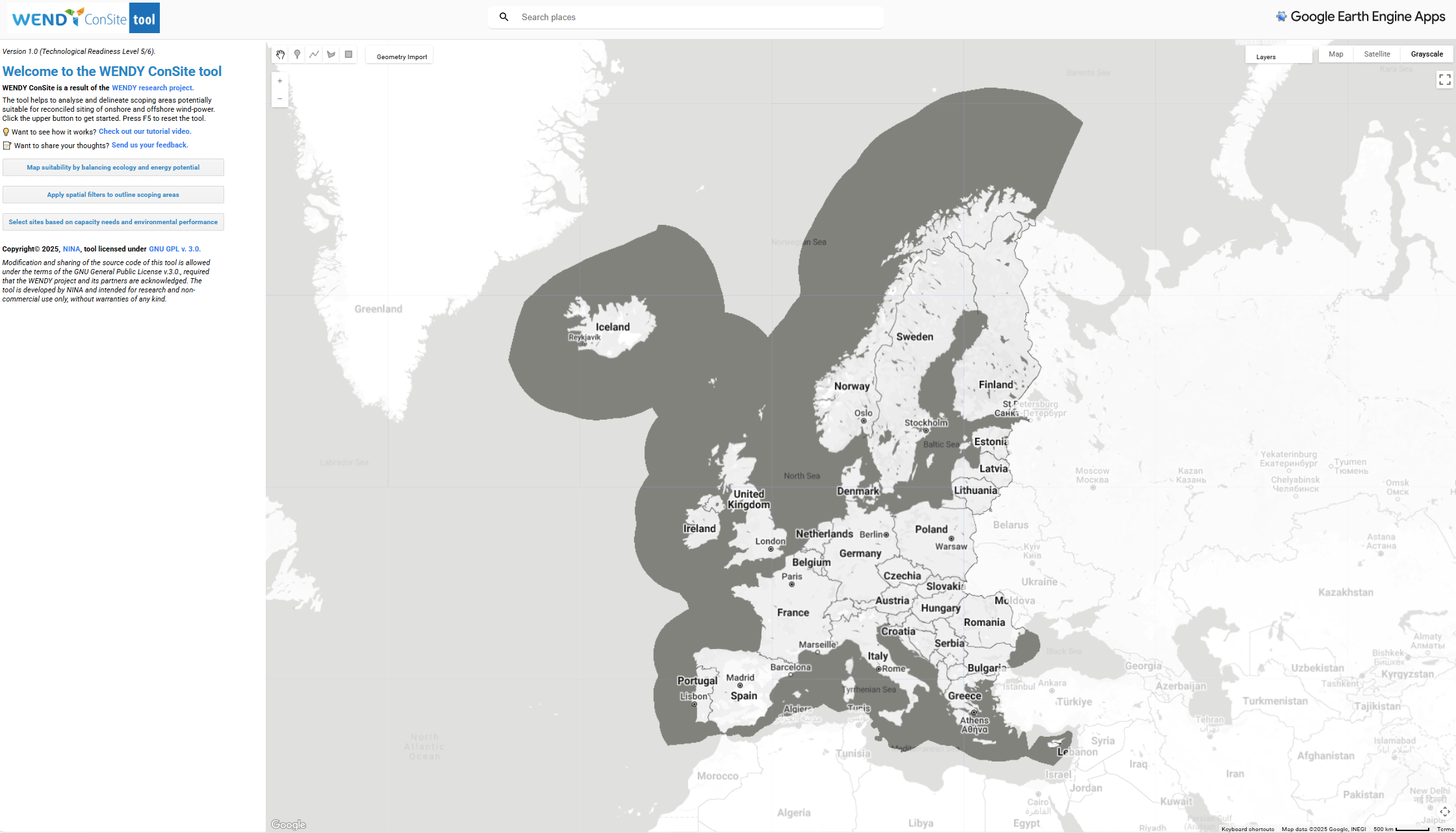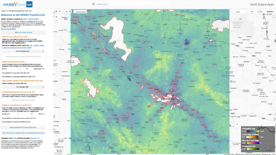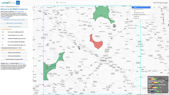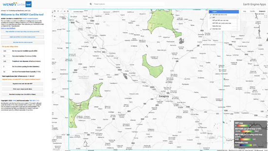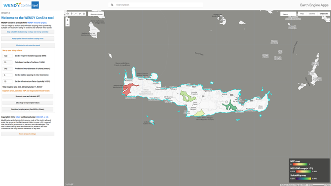 The tool is a web application developed in the Google Earth Engine Java API and uses the Google Cloud Platform for high-performance geospatial data processing. It consumes spatio-temporal datasets from NINA’s internal feature and image collections hosted on Google Cloud, including annual energy production layers, biodiversity layers, ecosystem services layers, LCOE, social constraint layers and curtailment layers. Inputs are provided via a JavaScript-based web interface; no user login is required, but users must manually adapt their browser zoom for optimal display. Users do not need to provide external data—all required inputs are pre-integrated and processed automatically based on user interaction with the map interface. More specifically, the WENDY toolbox requires the following user inputs: