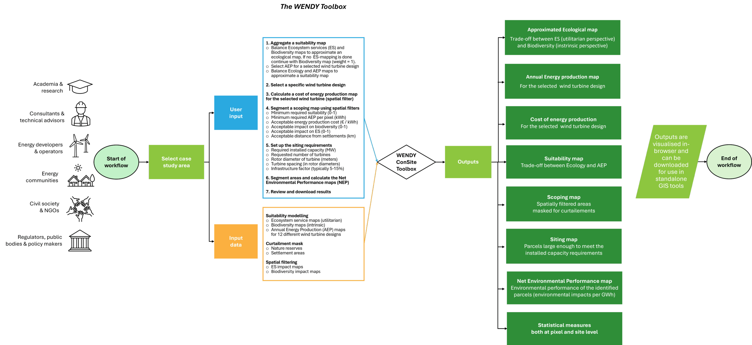 The WENDY toolbox guides users through a stepwise workflow to assess potential wind farm sites:
